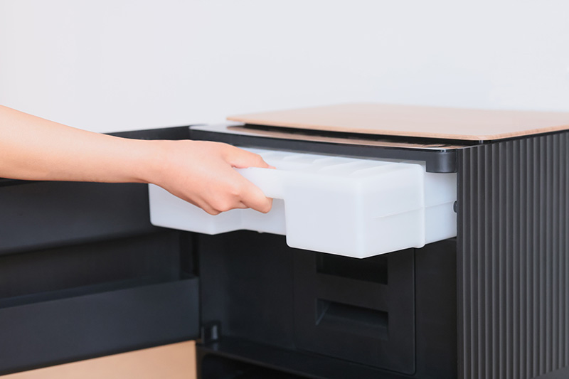 ゴミ収集・充電・給水まで備えた新「クリーンベース」。貯水タンク(写真下)は3Lと大容量で、最大30日間分(※2)の給水が不要だ