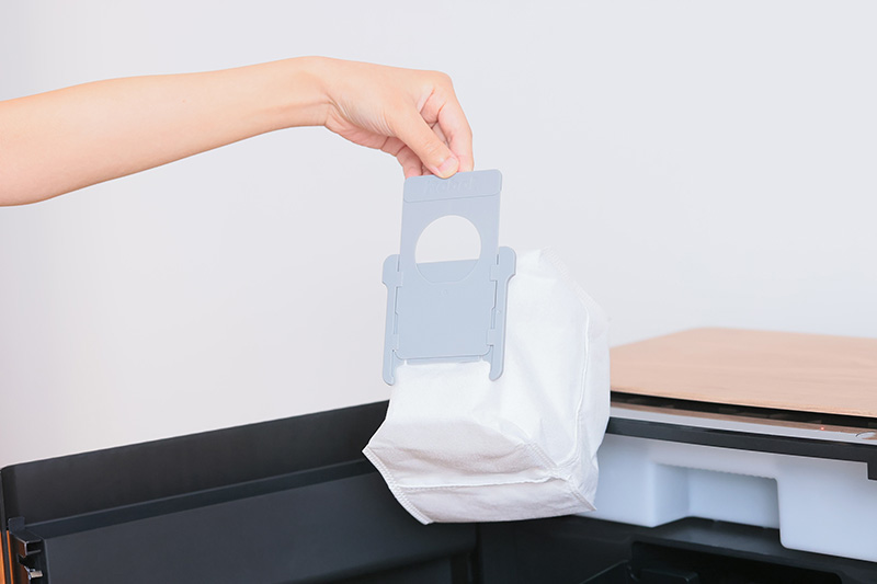 掃除が完了し「ルンバ コンボ」が帰還すると、本体のダスト容器のゴミを自動で「クリーンベース」内の紙パック(写真下)へと排出してくれる自動ゴミ収集機能を備えている。紙パックには数か月分(※3)のゴミを収容しておける。掃除が終わるたびにダスト容器のゴミを捨てるのは骨が折れるだけに、ゴミ捨てが数か月1回で済むのはありがたい限りだ