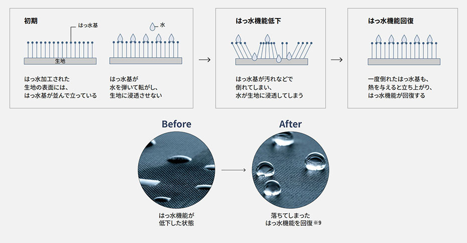 - ※11 はっ水加工されたものが対象です。防水加工とは異なります。〈はっ水回復」コースによるはっ水機能の回復〉[試験機関]ユニチカガーメンテック株式会社 [試験方法]はっ水機能が劣化したナイロン布をJIS L 1092はっ水度試験(スプレー試験)の比較見本にて評価[ はっ水回復方法]加熱温風による[ 対象部分]ドラム内の衣類[試験結果]初期1級、「はっ水回復」4級