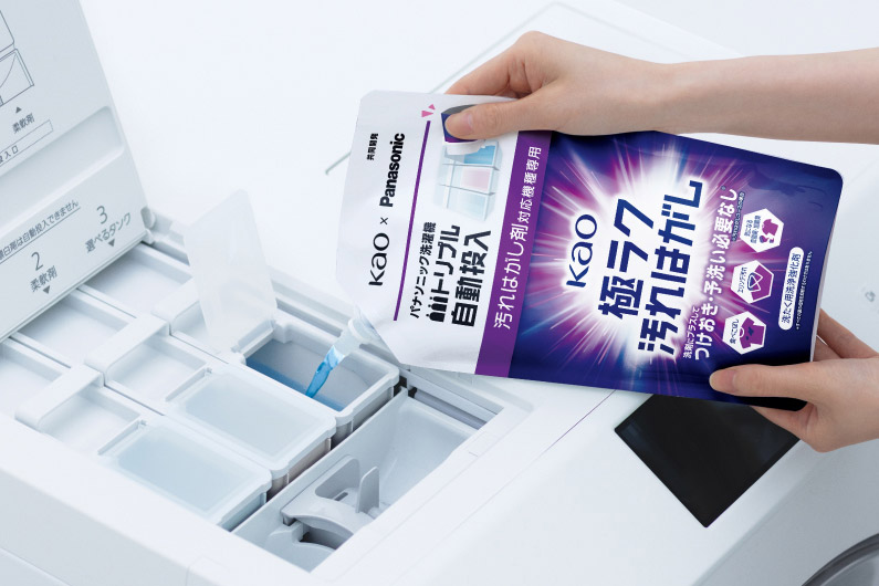 なお、予洗いについては、従来は手洗いによる予洗いやつけおきが必要だった蓄積した皮脂汚れ※9などを、予洗いなしでラクに落とせる※10「汚れはがしコース」を新搭載。パナソニックと花王が共同開発したトリプル自動投入専用の「汚れはがし剤」(別売)を使うことで、洗い工程の前に汚れを落としやすい状態へ変質させ、シャツの襟・袖口のガンコな皮脂汚れ※9も予洗いなしでラクに落とせる※10ようになった。ちなみに、「汚れはがし剤」とは汚れを落とす洗剤の効果を強化し、「汚れを落としやすい状態に変質」させる、これまでになかった新しい洗剤。トリプル自動投入専用だから実現できた成分などを含む「汚れはがし剤」を使うことで、今までの洗濯とは汚れへのアタックの仕方が異なるのが特徴だ。