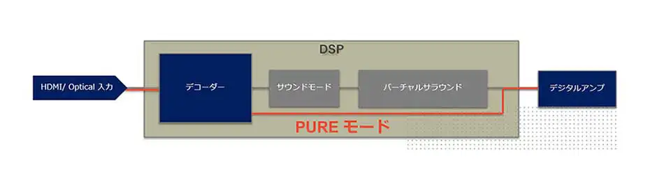 また、「DHT-S218」はサラウンド効果を足さない「Pure」というサウンドモードを持っている珍しいサウンドバーでもある。これはサウンドバーに入力された音声信号をデコードした後にアンプへ直接送り込むモードのこと。DSP(デジタルシグナルプロセッサー)で行われるバーチャル(仮想)サラウンド処理をバイパスし、高純度(ピュアな)再生を目指す趣旨だ。