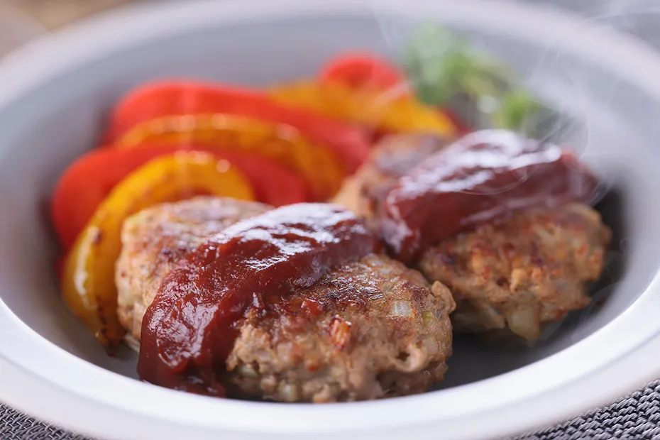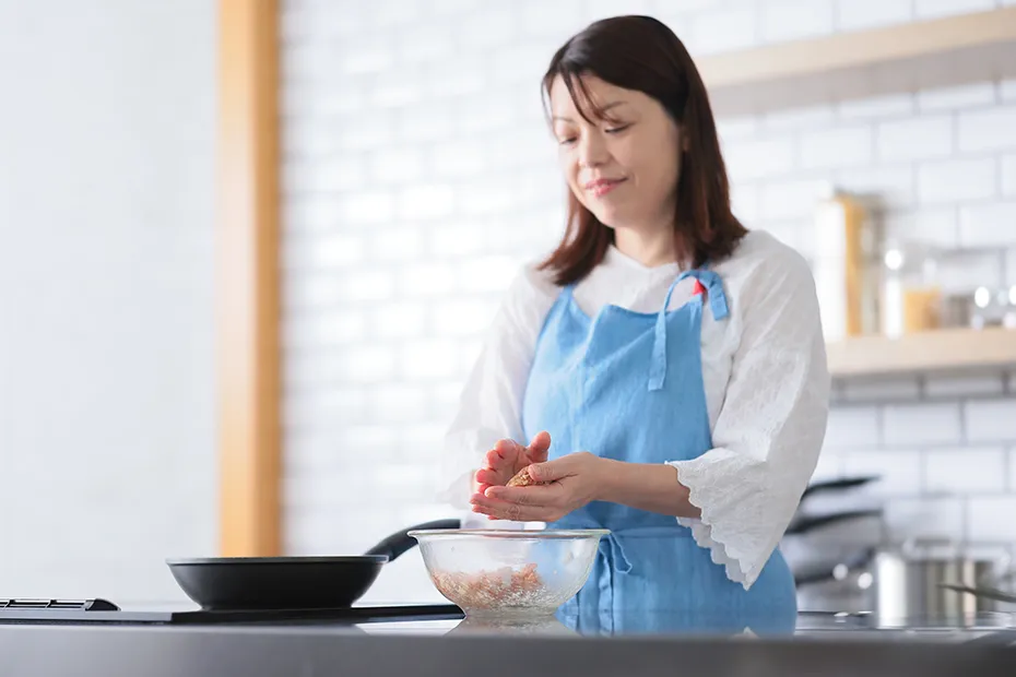ハンバーグは、ひき肉が冷たい状態で肉だねを作るのがポイント。そのほうが、肉汁が逃げにくいですから。「切れちゃう瞬冷凍A.I.」で冷凍保存して切り分けたひき肉なら、よく冷えた状態で肉だねを作れます。