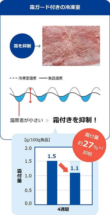 冷凍室内と食品の温度差が大きいと、食品の水分が昇華して霜が付いてしまう。「しっかり冷凍室」の「霜ガード」は、AIが使用状況を分析し、適したタイミングに自動で食品の霜の発生を抑制するというもの。一般的な冷凍室と比べて、霜付き量を約27%も抑制できるというから驚きだ
