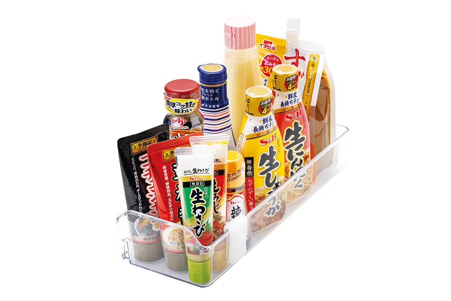 「ドアポケットレイアウトを自由に変更できる『思うままストッパー』や、散らかりやすい調味料のチューブなどを整理して収納できる『思うまま整理セット』などが用意されているので、使いたい食品がサッと見つかり、調理がはかどりますよ」