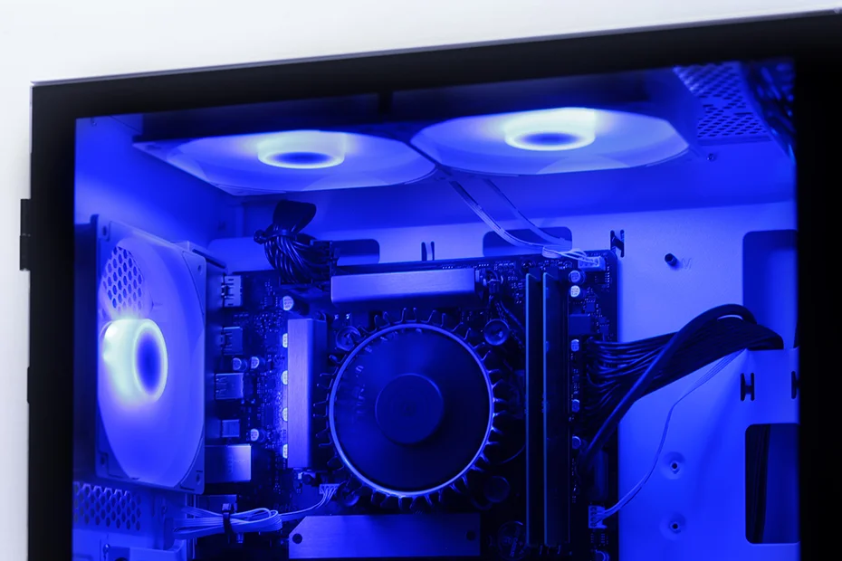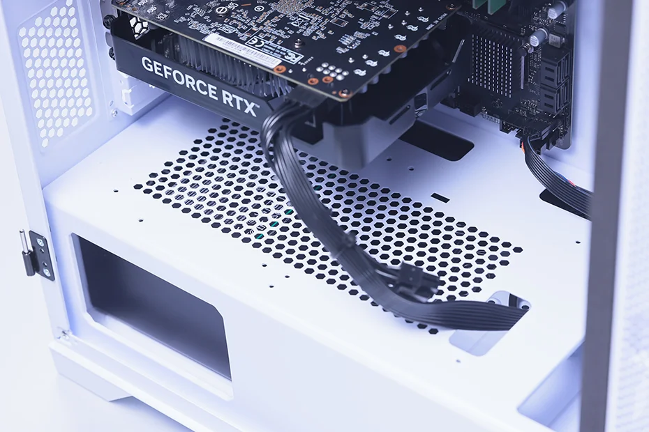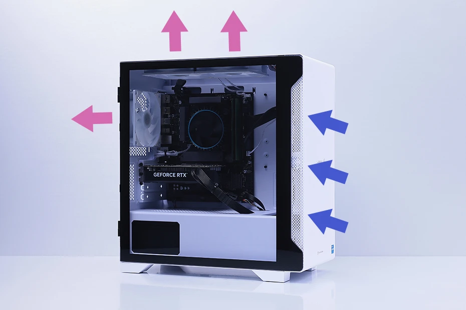 ケース前面左右から吸気し、CPUやGPUを冷却したのち、天面や背面から熱を逃がすエアフローを採用。マザーボード部と電源部を分離して相互の熱干渉を防ぐチャンバー構造も取り入れられ、搭載パーツのポテンシャルを最大限に引き出す作りとなっている