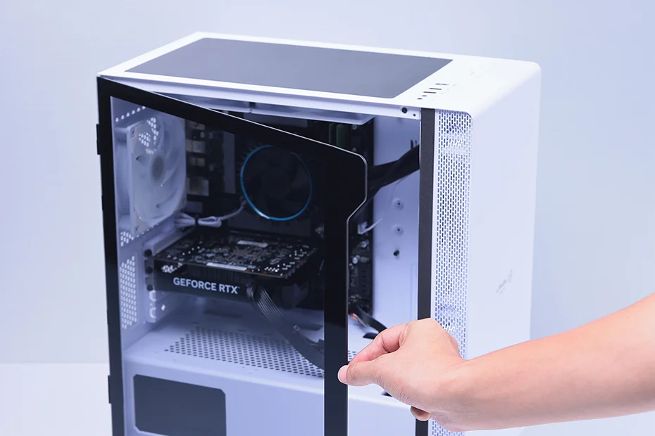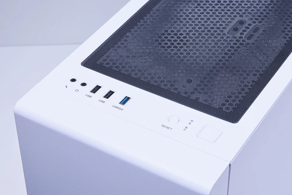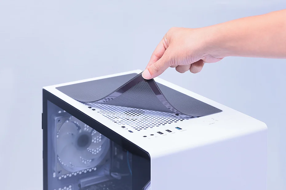 本機のケースはメンテナンス性にもすぐれており、天面に、ホコリの侵入を防ぐマグネット式のダストフィルターを備えるほか、サイドパネルには開閉が簡単なスイングドア方式を採用。初心者でもメンテナンスが簡単だ。また、ケース上部には、ヘッドホン出力ポートやマイク入力ポート、USBポートといったよく使うインターフェイスが配置されているので、デスクの下に設置しても周辺機器を接続しやすい。