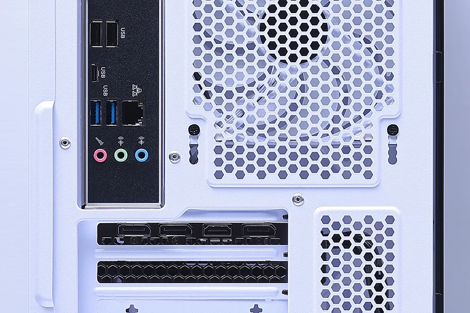外部インターフェイスは、背面にUSB2.0 Type-Aポート×2、USB3.2 Type-Cポート、USB3.0 Type-Aポート×2、ギガビット有線LANポート、マイク入力ポート、ライン出力ポート、ライン入力ポートを搭載。映像出力はDisplayPort×3、HDMI出力ポートの4系統だ。ケースの上部には、ヘッドホン出力ポート、マイク入力ポート、USB3.0 Type-Aポート、USB2.0 Type-Aポート×2が備わる