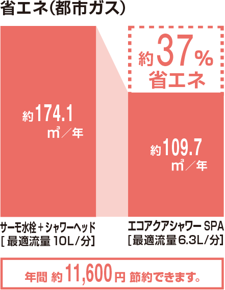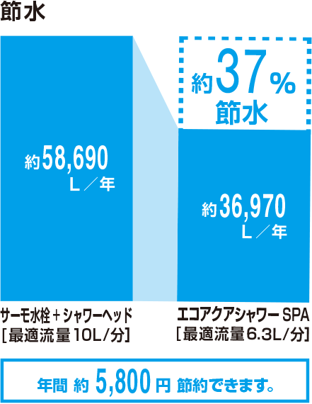 - ※1:【試算条件】(国研)建築研究所「平成28年省エネルギー基準に準拠したエネルギー消費性能の評価に関する技術情報(住宅)」における「東京・4人世帯」の条件にて算出。※使用比率はアクアスプレー62%、シルクミスト26%、パワーマッサージ12%で計算。※製品の使用状況等により、節水効果は異なります。【引用元】(国研)建築研究所「平成28年省エネルギー基準に準拠したエネルギー消費性能の評価に関する技術情報(住宅)」およびLIXIL基準【単価】上下水道:265円/m3(税込)、都市ガス:179円/m3(税込)、消費税率10%