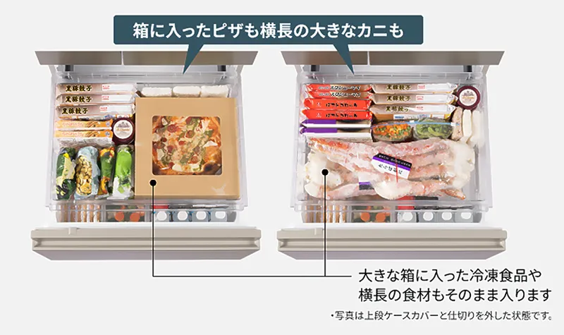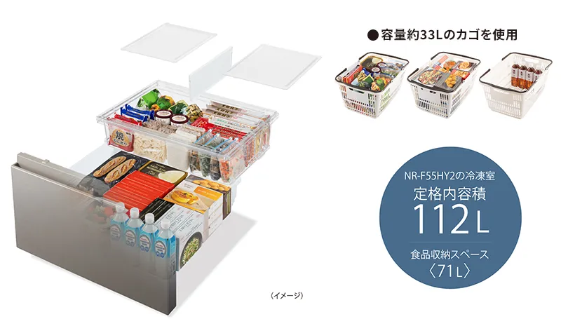 こうした失敗を防ぐために「NR-F55HY2」では、冷凍室の引き出しを100%全開にできる※3ことで、奥までしっかりと見わたせる「奥まで見えるフルオープン」を採用。さらに、冷凍室の上段には約12cmある深型ケースを採用することで、冷凍食品が管理しやすいタテ置き収納にも対応している。冷凍室の隅々まで確認できて、しかも整理整頓しやすい。冷凍食品のダブりや化石を減らせるため、家庭内での食品ロスが低減できるのは間違いなさそうだ。