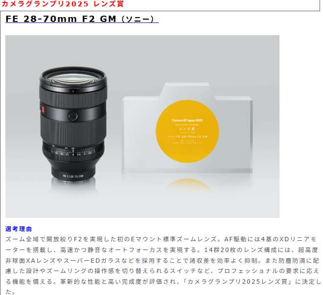「FE 28-70mm F2 GM」は、「カメラグランプリ2025」において、2024年度に発売されたレンズの中から最もすぐれた1本を選ぶ「レンズ賞」を受賞した