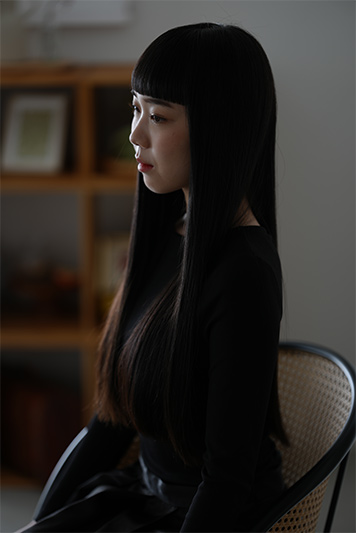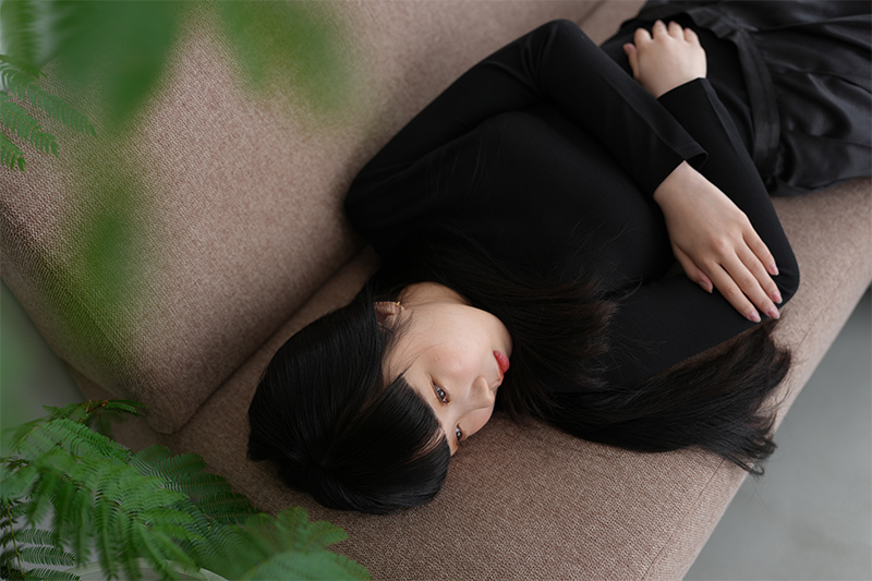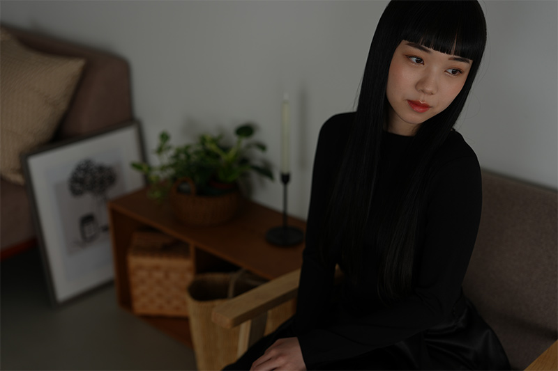 モデルが顔を向けている方向から、わずかに窓際の光が差し込む暗所のシーンで撮影している。F2の開放絞り値を利用し、自然光による繊細なトーンを、低感度で高画質に切り取った。このシーンは全体的に光が届きにくく、室内の定常光を利用することも検討したのだが、明るくは撮れるもののそれではどうしてもフラットな描写になる。暗所ならではの自然な立体感も、このレンズなら手持ちで容易に撮れてしまう。