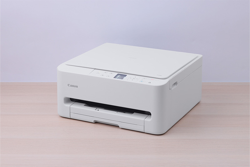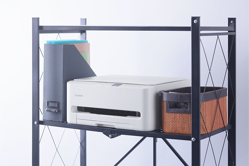 前モデルに比べて幅が小さくなった「PIXUS TS5530」。給紙、排紙、キー操作を前面から行えるため、本体の横や後ろにスペースを確保しなくて済む。棚の上のちょっとした空きスペースにもするりと収まった