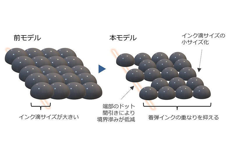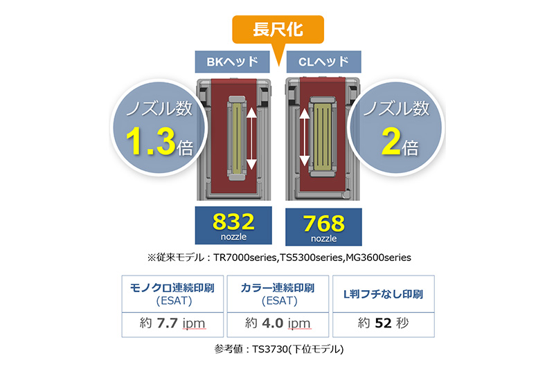 プリントヘッドの長尺化とともに、ブラックインクのヘッドのノズル数は従来モデルの約1.3倍となる832本に、カラーインクのヘッドのノズル数は従来モデルの2倍となる768本に増加。これにより、A4普通紙モノクロで約14枚/分、カラーで約9枚/分の高速印刷を実現している