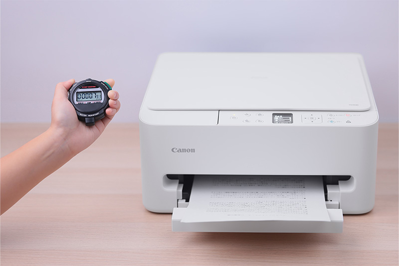 A4普通紙モノクロの印刷速度を計測してみたところ、1枚目の印刷完了までにかかった時間はわずか約7.9秒。「え、もう?」と驚いてしまうほどのスピードだ。そのまま軽快に印刷が進み、14枚の印刷にかかった時間は約1分3秒。ほぼカタログスペックどおりの印刷速度が確認できた