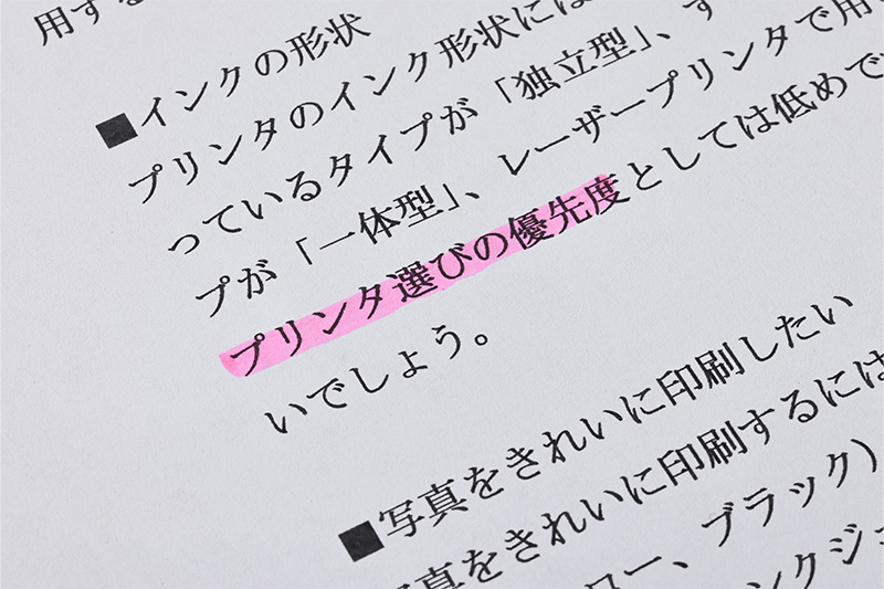 「PIXUS TS5530」で印刷した文書は、確かに印字がシャープでクリア。画数の多い漢字もきれいに印刷できており、水性マーカーを引いてもにじまず機能的だ。また、図やグラフの入った資料も印刷してみたが、全体的に高コントラストで、メリハリがある。見やすく、読みやすいので、ビジネス資料の印刷にも十分に使用できる