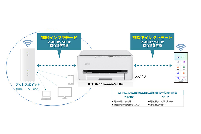 また、無線LANルーターがなくてもスマートフォンと直接ワイヤレス接続できる「QRコードダイレクト接続」に対応。無線LANルーター経由の接続と、「QRコードダイレクト接続」、いずれも2.4GHz/5GHz帯を切り替えられる「デュアルバンドWi-Fi」をサポートしており、プリンターの設置環境に合わせて、最適な接続方法、接続周波数を選べるのが便利だ。