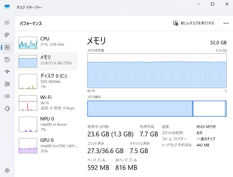 マルチタスク時のメモリー使用量を「タスクマネージャー」で確認。10のウィンドウを立ち上げたうえ、「Microsoft Edge」で30ものタブを開いても、メモリーにはまだ約25%の空きがあったから驚きだ