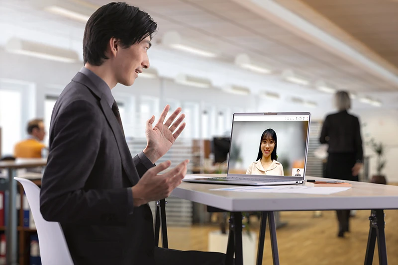 ビジネスでとりわけ役立つのは、Webカメラ映像に加工を施して、理想的なWeb会議を実現する「Windows Studio Effects」だ。周囲に人がいる場所や自宅などからWeb会議に参加する場面、背景映像を隠したいもの。そんなとき、「Windows Studio Effects」を使えばツールを問わず背景を自然にぼかせるため、セキュリティやプライバシーをしっかりと守れる。さらに、目線を常に相手に向けられる「アイコンタクト」や、自分の顔にズームできる「自動フレーミング」も利用可能。相手に好印象を与えながら快適にコミュニケーションできるから、商談も弾むはずだ。