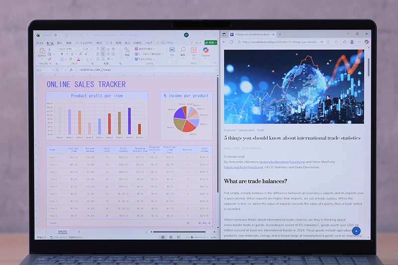 縦方向にも十分な広がりがある16:10のアスペクト比だから、一画面に2つのウィンドウを並べても狭苦しさがない。しかも、2.5Kの高解像度により細かい表の文字まで鮮明。これなら、調べものをしながらの文書作成も快適にこなせる
