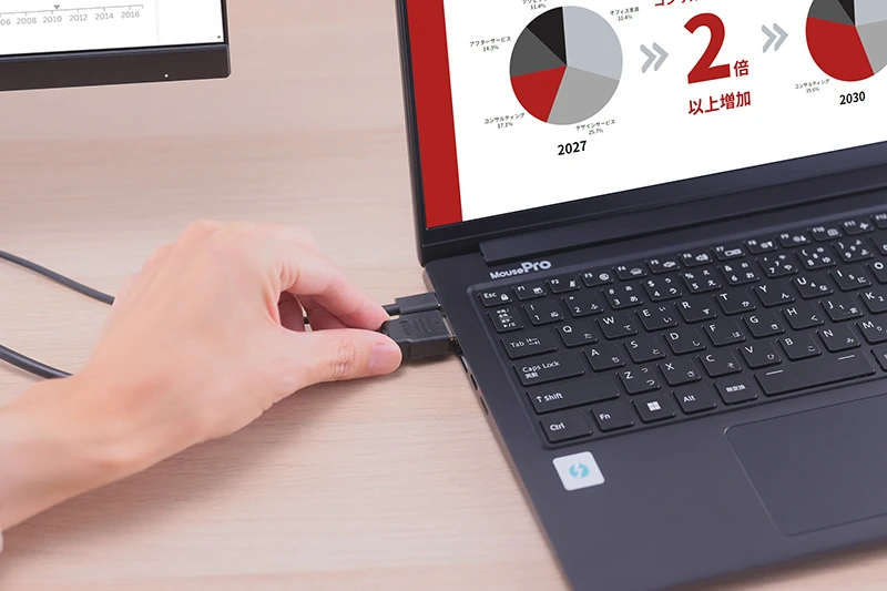 一般的な外付けディスプレイを使用する場合、HDMIケーブルなどの映像ケーブルと、ノートPCの充電ケーブルの2本を、接続する手間が必要になる。加えて、マウスやキーボードなどの周辺機器まで接続するとなると、仕事の勢いも大きく削がれてしまう