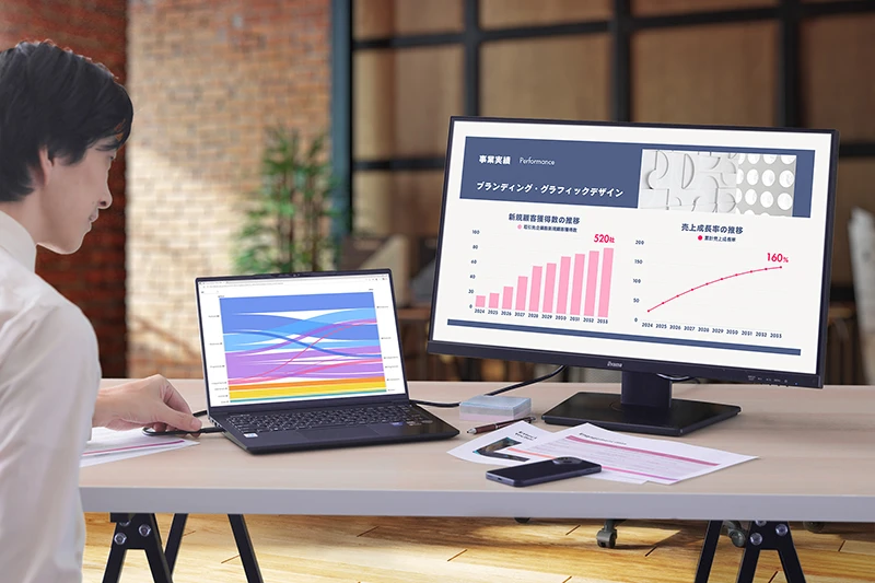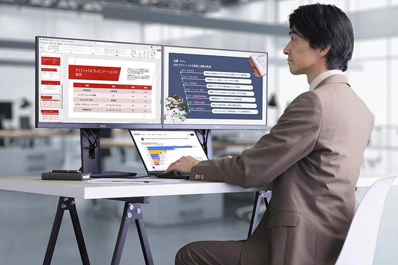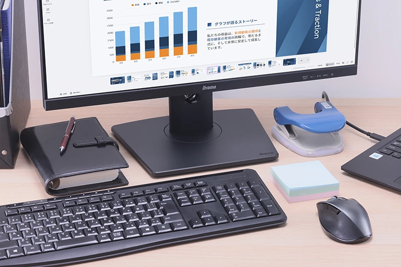 ノートPCを拡張するために外付けディスプレイを選ぶなら、接続のしやすさにこだわりたい。その点で魅力的なのが、USB Type-Cポートを搭載したiiyama「ProLite」シリーズだ。本機なら、USB Type-Cケーブル1本でノートPCと接続するだけで、映像入力と同時に高出力で給電できるうえ、USBハブ機能も活用できる。また、可動範囲の広い多機能スタンドにより、体格やデスク環境を問わず、画面を見やすくセッティングできるのもうれしい。そんな「ProLite」シリーズがアシストする、理想のビジネス環境に迫ってみよう。