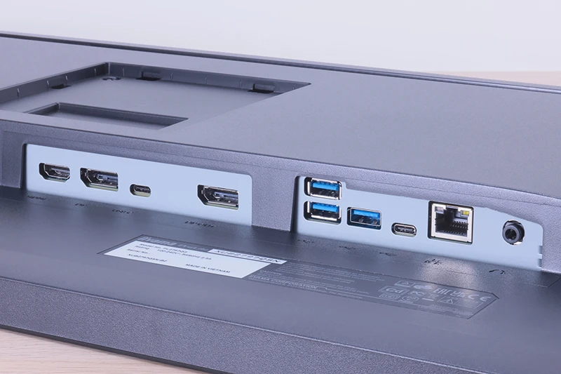 映像入出力インターフェイス(写真左側)としては、HDMI入力ポート、DisplayPort(入力)、USB3.2 Gen1 Type-Cポート(アップストリーム)、DisplayPort(出力)を装備。その他のインターフェイス(写真右側)としては、USB3.2 Gen1 Type-Aポート×3、USB3.2 Gen1 Type-Cポート(ダウンストリーム)、有線LANポート、ヘッドホン端子を装備