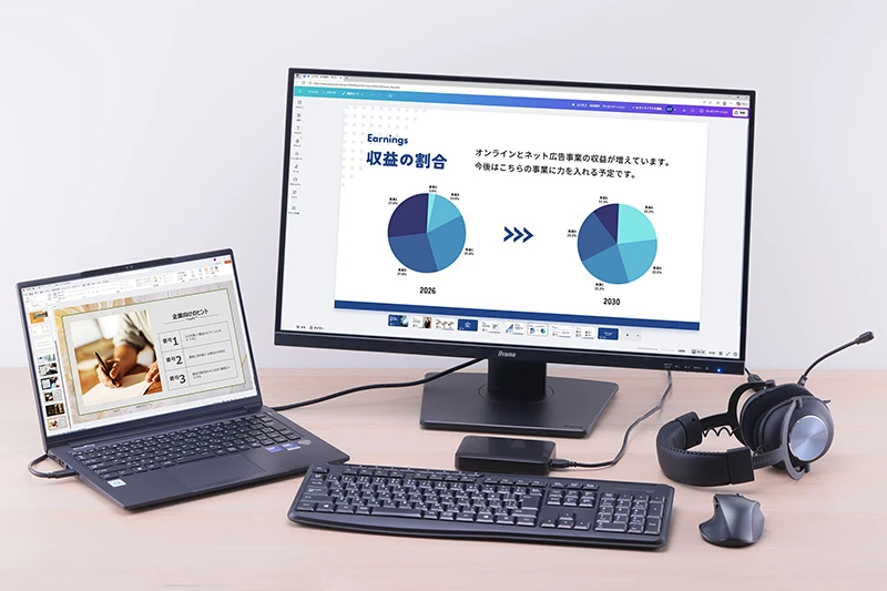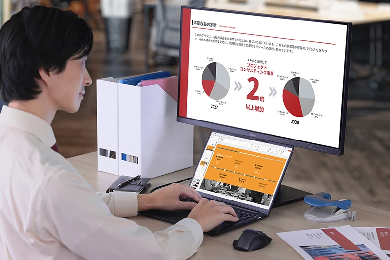 オフィスと自宅で仕事をこなすハイブリッドワーカーや、営業や打ち合わせで社外に出かける場面が多いビジネスパーソンにとって、持ち運びやすいモバイルノートは必需品だ。しかし、コンパクトなモバイルノートが装備するディスプレイは、13〜14型クラスというケースが多い。デスクに腰を据えた際に生産性を高めるには、やはり画面の大きな外付けディスプレイを活用したい。
