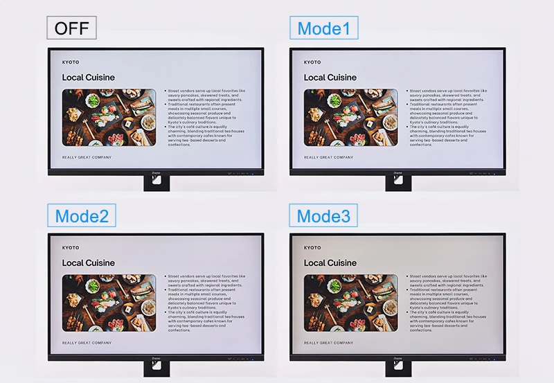 「Blue Light Reducer」の低減レベルは、Mode1(右上)、Mode2(左下)、Mode3(右下)の3段階。オフ時(左上)と比べると、段階ごとに青みが弱まり、目にやさしい色合いになっているのがわかる