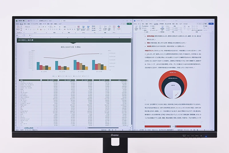 表示領域が広くて緻密だから、細かい文字や数字が記載されたExcel文書やWord文書を並べて表示しても、このとおり見やすい。発色にすぐれたIPS液晶パネルにより、グラフなどの色をはっきり視認できる点も秀逸だ