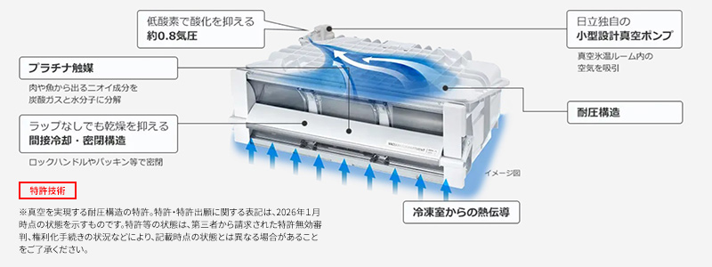 - 食品を真空環境で保存する「真空氷温ルーム」を搭載