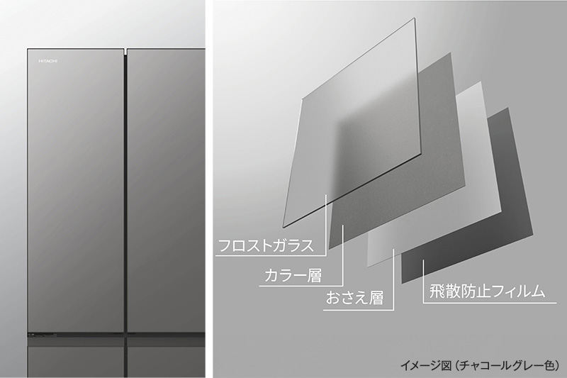 美しいデザインも、「R-HZC62Y」の見どころだ。インテリアとの調和性を高めるため、要素を減らし、水平垂直基調に仕上げるとともに、やわらかな輝きのフロストガラスを採用。扉上部のヒンジ部やハンドルの手掛け部をガラス面で見えにくくし、ガラス周囲のフレームを細くすることで、ガラス面を大きくするなど、日立のデザインへのこだわりがそこかしこに見て取れる。