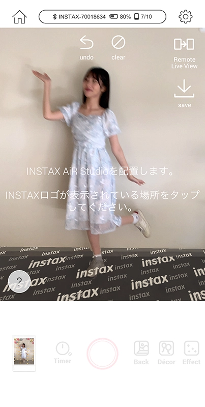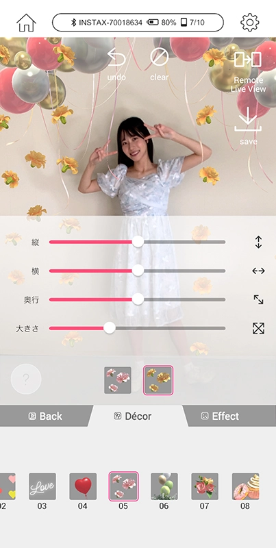 バルーンやハートなどの背景素材に加え、文字や花などの装飾やエフェクトで空間を多彩に演出できる。指先で配置やサイズを調整してプリントすれば、まるでスタジオで撮影したかのような表現豊かなチェキプリント™ができた