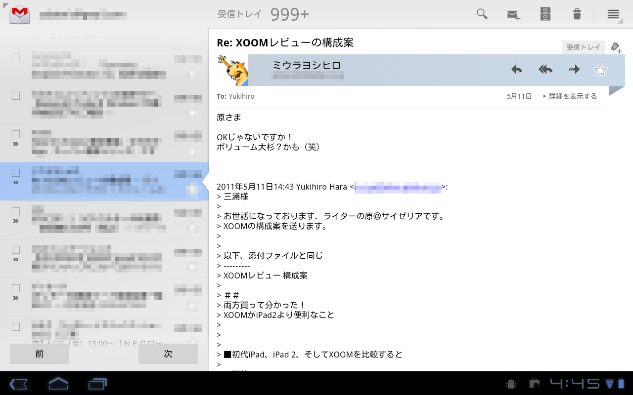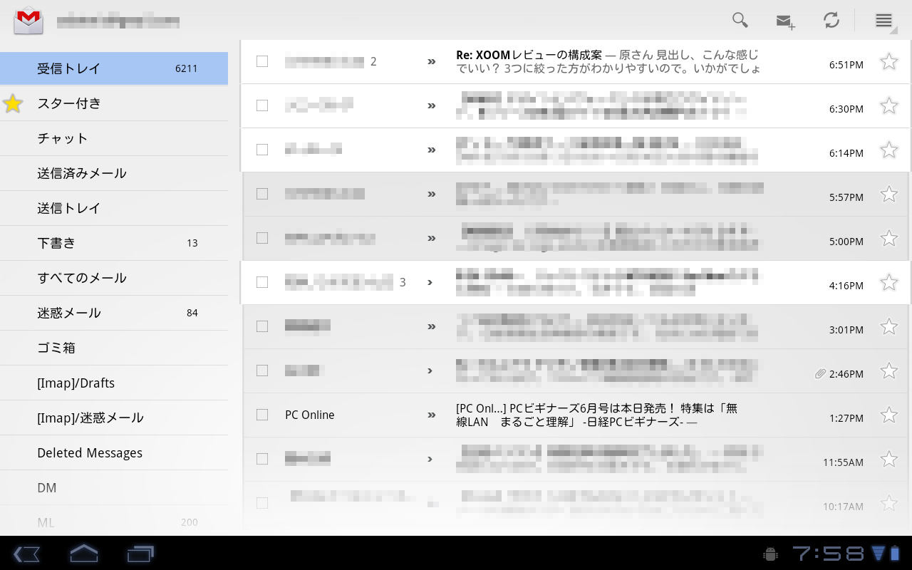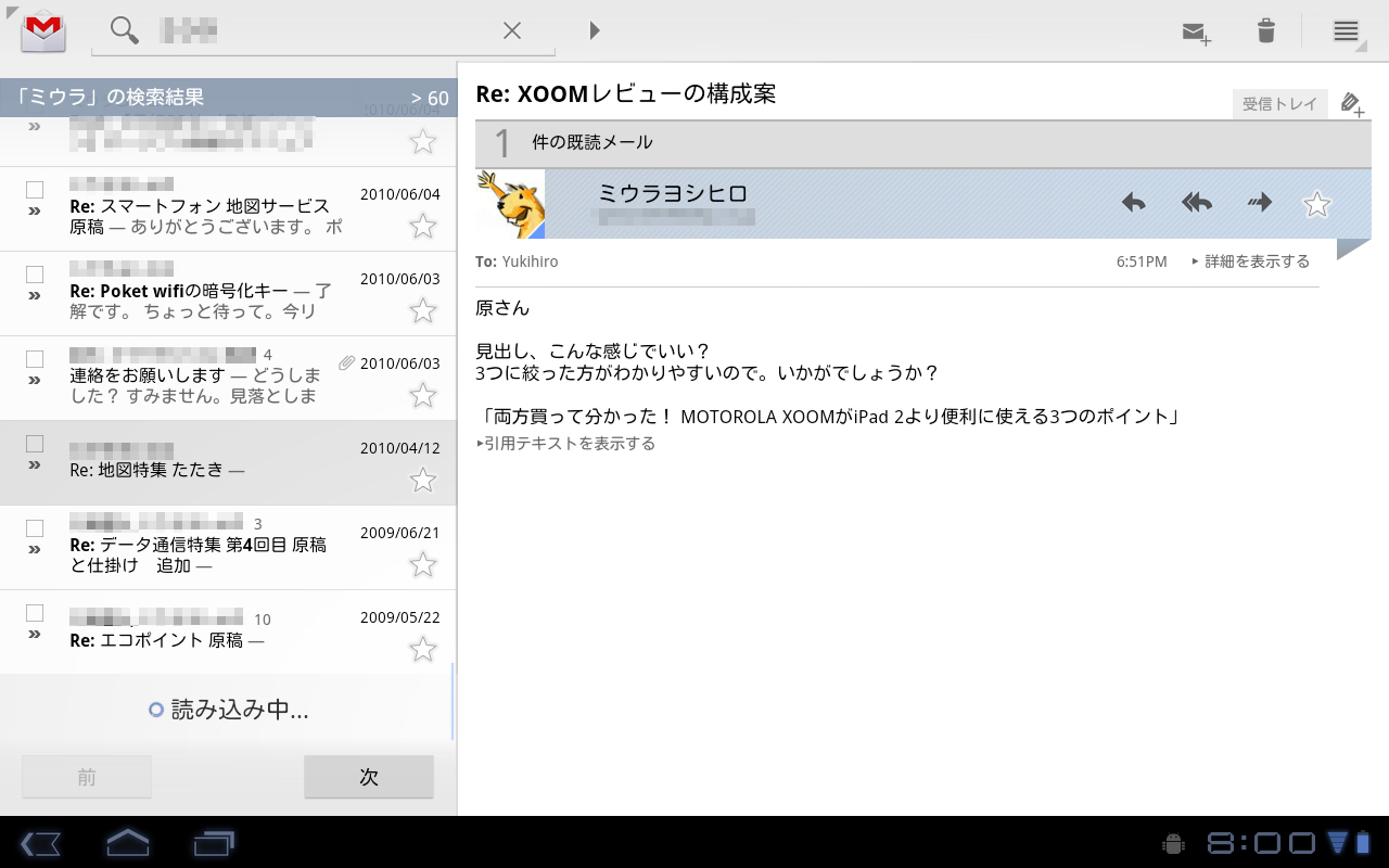 この点、Android 3.0対応のGmailアプリなら、全く問題ない。アプリを起動すると、受信トレイが2カラムのインターフェースで開く。左側に件名一覧、右側にメールの本文という構成だ。件名欄を下から上へスクロールさせると、過去のメールをGmai上から取得してくれる。また メールの階層を1つ上に移動すると、左側にはスター付きやラベル、送信済みのメールの欄が表示され、右側には差出人名と件名を併記する一覧に切り替わる。ウィジェット機能を使い、ホーム画面で新着メールを確認できるのもAndroidならではだ。自宅でのメールチェックは、もっぱらXOOMを使っている。