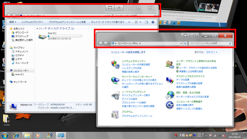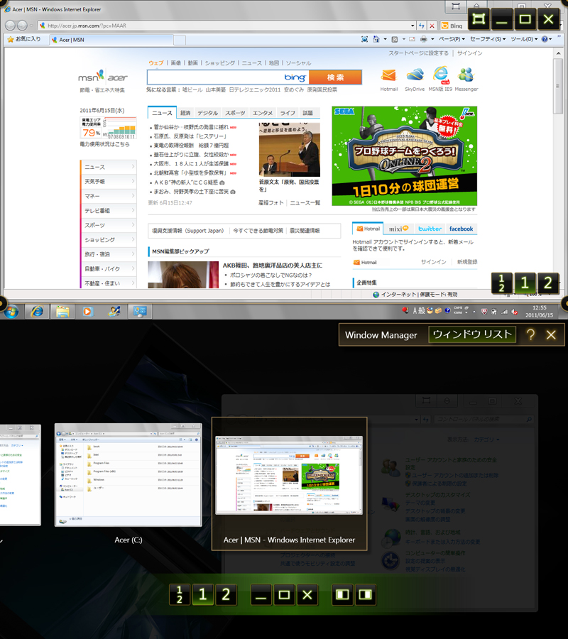通常は「最小化」「最大化」「閉じる」の3つのボタンしかないが、ICONIAにはその左側にウインドウを上下の液晶間で移動させるボタンと「ウインドウリスト」の表示ボタンがある。