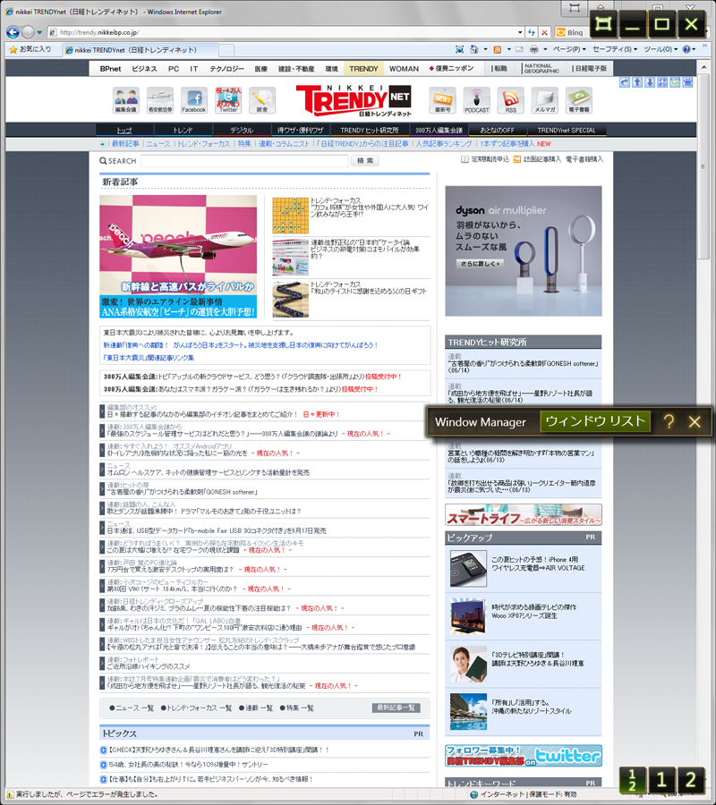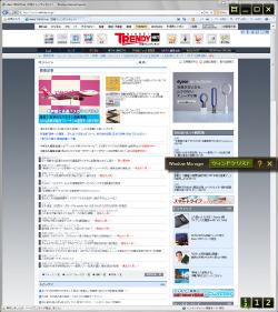 ウインドウリストを表示すると、ウインドウを上の液晶、下の液晶に移動させたり、上下をあわせた1つのデスクトップにまたがるように表示したりできる。縦長のWebサイトを上下の液晶すべてを使って表示すると便利そうだ。操作は画面全体に触れて操作してもいいし、マウスを使ってもいいだろう。プレゼンテーションなどに使うと効果がありそうだ。