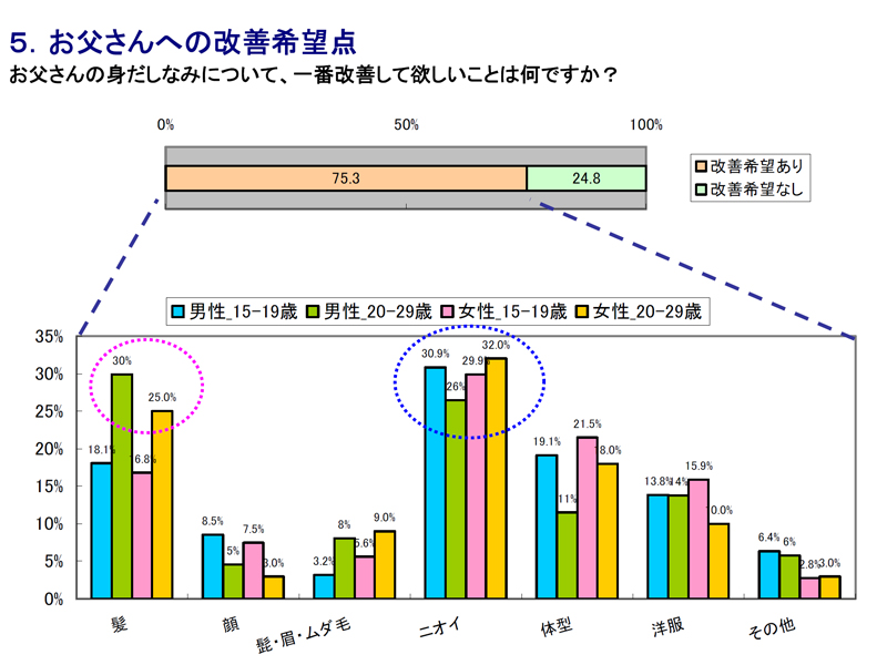 またマンダムでは、「父の日」にちなみ、「ルシード」ブランドのターゲット層であるミドル男性(40〜54歳の父親)が息子、娘たちからどのような印象を持たれているのかの意識調査も行った。そこでは「子供の70.9%がお父さんのニオイを感じており、そのうち84.5%は不快なニオイ」と答えているとしている。つまりニオイ対策重視傾向は現時点では若い世代を中心だが、いずれ全世代に広まることは避けられないだろう。