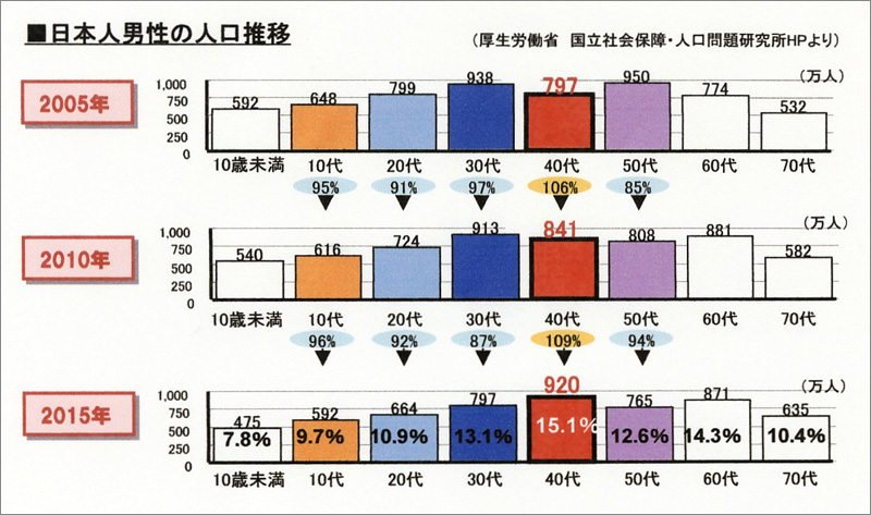 不景気に強いといわれる化粧品市場。だが2008年秋以降の景気後退の影響や国内の化粧品市場の成熟、少子高齢化による人口減を受け、市場全体は縮小傾向だ。そんななか、唯一伸びているのが「男性用化粧品」。なかでも、まもなく全世代で最大のボリュームゾーンになるミドル世代(グラフ1参照)をターゲットにした“男性用アンチエイジング(抗加齢)ケア”商品の成長が期待されている。