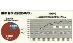 その主戦場は、ドラッグストア。現状のドラッグストアはオーバーストア状態で1店あたりの客数や客単価が減っている一方、男性客は増加している(グラフ2参照)。顧客の8割を占める女性を対象にした商品は頭打ち状態のなか、男性に高付加価値商品を売れるかどうかがドラッグストアの死活問題となるのだ。“男性用アンチエイジングケア”という新たな需要が掘り起こせるとあって、ドラッグストアは販促活動に積極的だという。