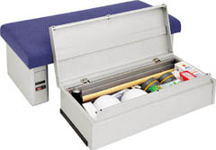 普段は休憩室や受付スペースなどで使用できるおしゃれなベンチ。ベンチシートの下のキャビネットには救助工具を収納できるようになっており、キャビネット部分はいたずらや盗難を防止するために施錠も可能だ。