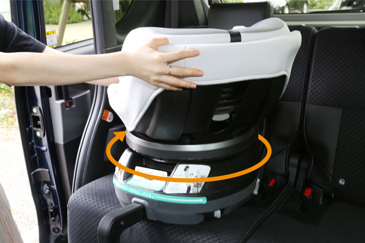 - シートが左右に回転する機能。車のドア側にシートの向きに変えられるため子供を乗せやすく、乗せ降ろしがスムーズになります。特に、チャイルドシートを車の進行方向のうしろ向きに設置する必要があり、取り付けしにくい1歳頃までの間に活躍します。