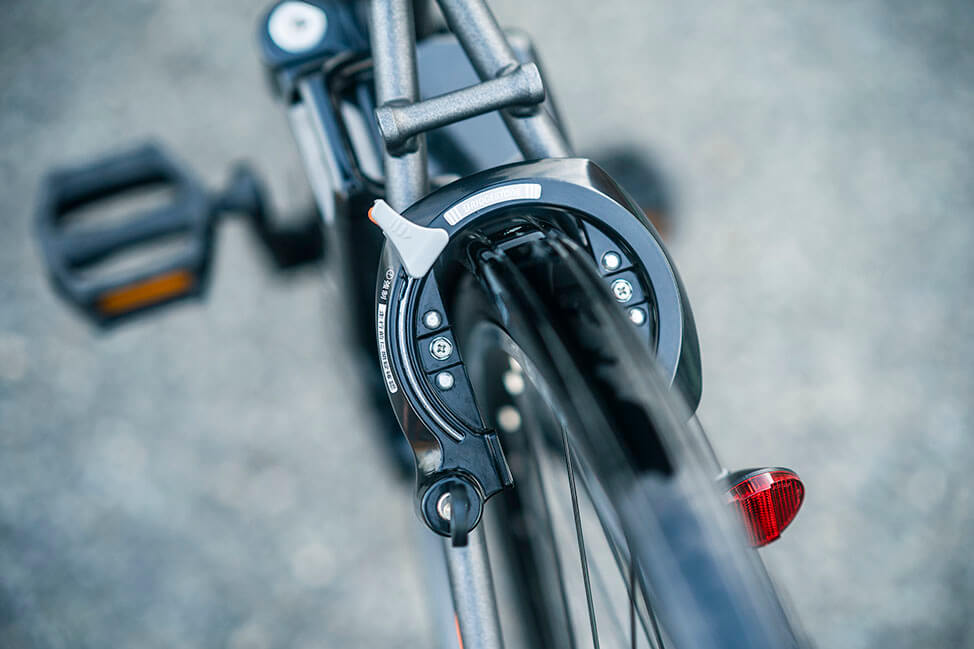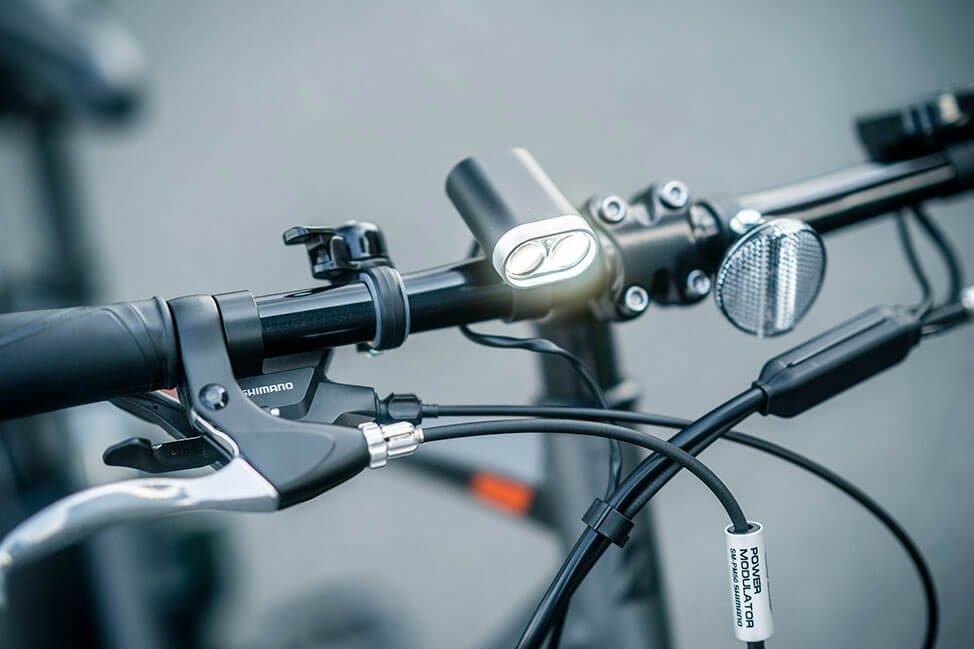 これにより走り出しからすぐれた安定感を発揮することに加え、回復充電機能が搭載されている点も大きなトピックです。 回復充電とは、走行中にペダルを止めたときや、左ブレーキレバーを握ったときに、前輪のモーターユニットが発電機となって運動エネルギーを電気エネルギーに変換 → バッテリーに回収する、というもの。
