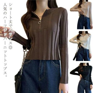 ニット 送料無料 脚長効果 長袖 セーター ハイネック ニットトップス プルオーバー レディース ファスナー 秋 春 おしゃれ ショート丈