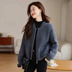 ニットカーディガン ウール100% ファスナー開閉 スタンドカラー リラックスフィット ショート丈 秋冬 トップス カジュアル 上品通勤 羽織り