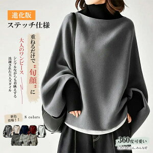 ハイネック トップス オーバーサイズ ゆるふわニット 長袖 ゆったり 無地 冬 秋冬 ふわふわ 柔らかい バットスリーブ ドレープ感 重ね着風 大人かわいい ニット ゆったりフィット 体型カバ