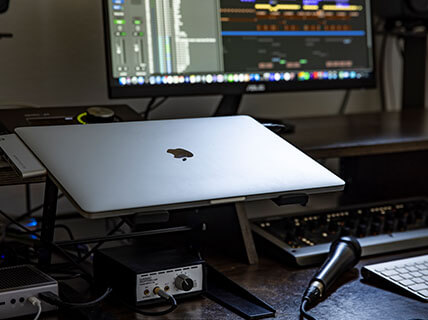 持ち運べるパソコンとして2017年に購入。Logic ProユーザーのためMac。作業効率を重視して、クラムシェルモードで外部モニターに出力する。制作はパソコン上のプラグインやソフトウェアで完結。ソフトウェアとOSの互換性による不具合を避け、むやみに買い替えない主義だ。