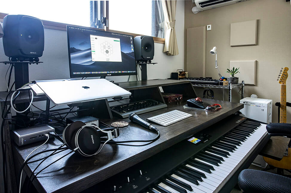 幼少期からピアノを操るESMEさんは、リアルなピアノにこだわり、88鍵のMIDIキーボード・コントローラー、Studiologic社の「SL88 STUDIO」を選んだ。「自分の理想に合うものは、これしかなかった」という。大型の本体もすっぽりと配置・収納できるDTM用のデスクを導入したのは、コンパクトな仕事場ながら、作業効率を極力高めるためだ。