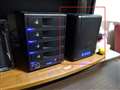 | 画像@ 赤枠が本機『GW3.5MX4-SU2CB』です。 | 画像A 左隣のHDDケースのように1つ1つの扉ではなくフタの構造になっています。 | 画像B 本体裏側です。 |