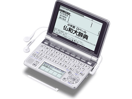 フランス語辞書搭載の電子辞書を買うのはこれが3台目です。しかし2年ぶりなので、どれだけ進化しているのか楽しみでした。 辞書の第一印象はでかい、重い。6年前に買った電子辞書を彷彿とさせました。本当でかくて重いです。音声が出る辞書はみんなこんなに大きいのですかね?それとも、パソコンとつなぐことができるから? 僕がこの辞書を選んだ理由は仏和大辞典が入っているからです。これまでのフランス語電子辞書は、プチ・ロワイヤル仏和辞典かクラウン仏和辞典使用で、収録語はせいぜい4万5千語でしたが、仏和大辞典は収録12万語。フランス語の勉強にはかなり役立つでしょう。 2年前になかった機能として、活用表にジャンプで飛ぶことができます。フランス語の文を書くときかなり便利そうです。逆に活用されているものから原型を引くこともできます。 フランス語辞書でも音声を読み上げてくれるのですが、英語辞書に比べると登録数がいま一つ。でもないよりはずっとましです。 フランス語辞書にもスペルチェック機能がほしいです。 電池の持ちは70時間ということですが、ものによっては110時間くらい持つ電子辞書もありますよね?そういう意味では少し短いですね。 タッチペンの手書き機能ですが、漢字字典とメモ以外では、そんなに使える機能ではないなと思いました。中国語が搭載の辞書なら、かなり使えそうです。 英語・仏語辞書で例文を出すためには、必ずタッチペンを用いなければいけないのは痛いです。(例文を出すためのボタンがない。) タッチペンをなくしてしまったらどうなるんですか?買わないといけないんですよね?非常になくしそうです。なくしたら例文がみれません。例文を見るためだけにペンを取り出すのもめんどうです。 手書き用パネルのすぐ右に「戻る」ボタンがあって、ペンで書いている最中に手で勝手に押してしまいます。そしたら今まで書いたものが全て消えます。本当よく押してしまいます。このボタン配置は最悪です。左利きの方なら問題ないでしょう。 ブリタニカ大百科事典、百科事典マイペディアも搭載で、国語・英語辞書は充実しています。 最近では当たり前っぽいですが、複数辞書検索は便利だと思いました。