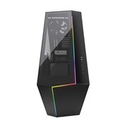 多角形を組み合わせた特徴的な外観のミドルタワー型PCケース。上面部から前面部にかけてアドレサブルRGB LEDストリップを配置し、そのラインを境界として左側には強化ガラスパネル、右側にはスチールパネルを装備する。