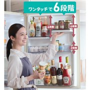 - 幅60cm、出し入れしやすいコンパクトタイプの冷蔵庫(356L)。ワンタッチで簡単に高さを6段階調整できる「フリードアポケット」を採用。
